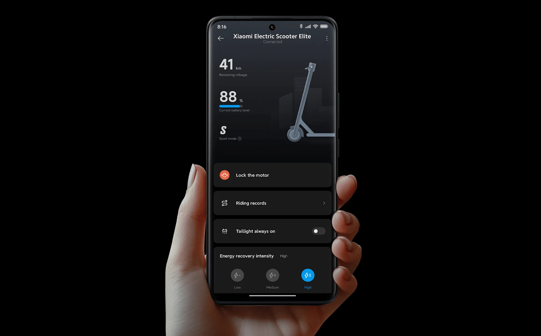 Особенности | 3 скоростных режима, cистема рекуперации кинетической энергии, бесщеточный двигатель, влагозащита IPX5, задний стоп-сигнал, система интеллектуального управления BMS, указатели поворота |